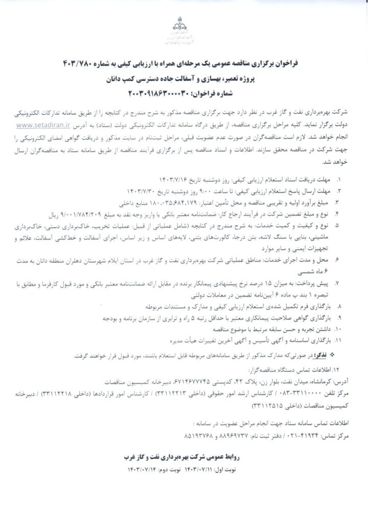 فراخوان برگزاري مناقصه عمومي يك مرحلهاي همراه با ارزيابي كيفي به شماره 403/780