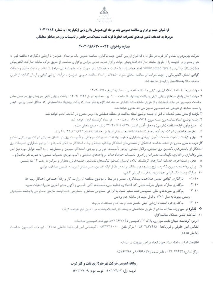 مربوط به خدمات تأمین تیمهای تعمیرات خطوط لوله نفت، تسهیلات سرچاهی و تأسیسات برق در مناطق عملیاتی