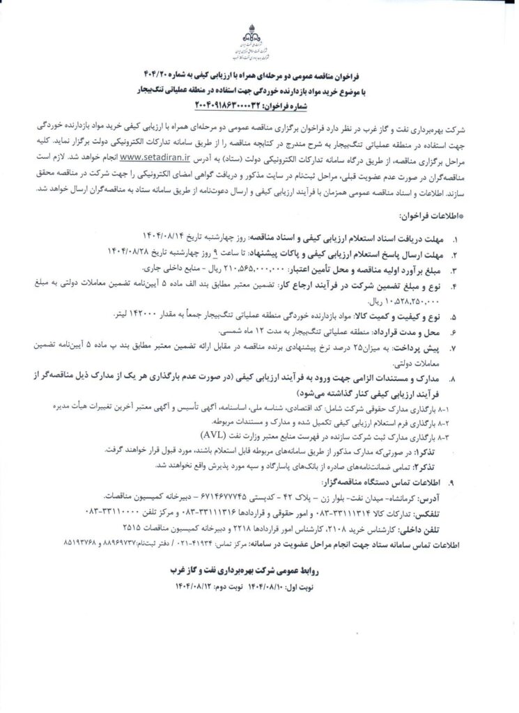 با موضوع خرید مواد بازدارنده خوردگی جهت استفاده در منطقه عملیاتی تنگبیجار