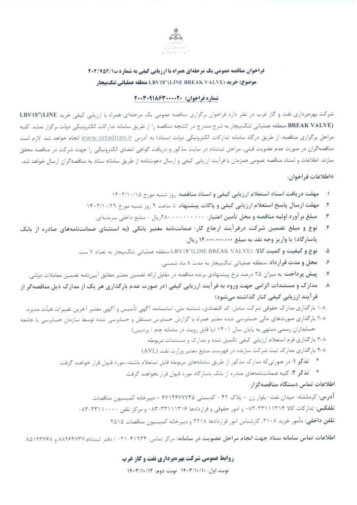موضوع: خرید LBV18”(LINE BREAK VALVE) منطقه عملیاتی تنگبیجار