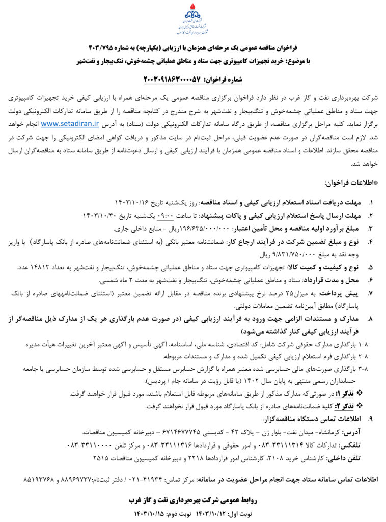 با موضوع: خرید تجهیزات کامپیوتری جهت ستاد و مناطق عملیاتی چشمهخوش، تنگبیجار و نفتشهر