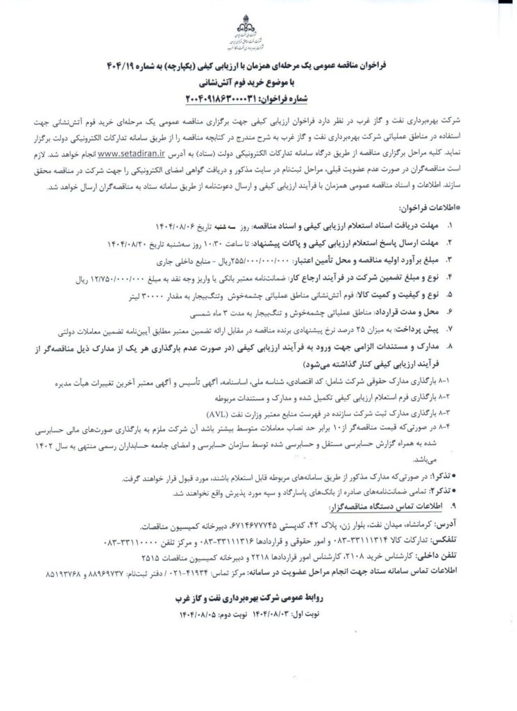 فراخوان مناقصه عمومی یک مرحله‌ای همزمان با ارزیابی کیفی (یکپارچه) به شماره 404/19