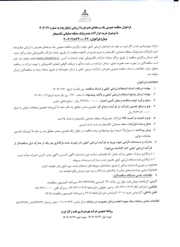 با موضوع خرید ابزارآلات هیدرولیک منطقه عملیاتی تنگبیجار