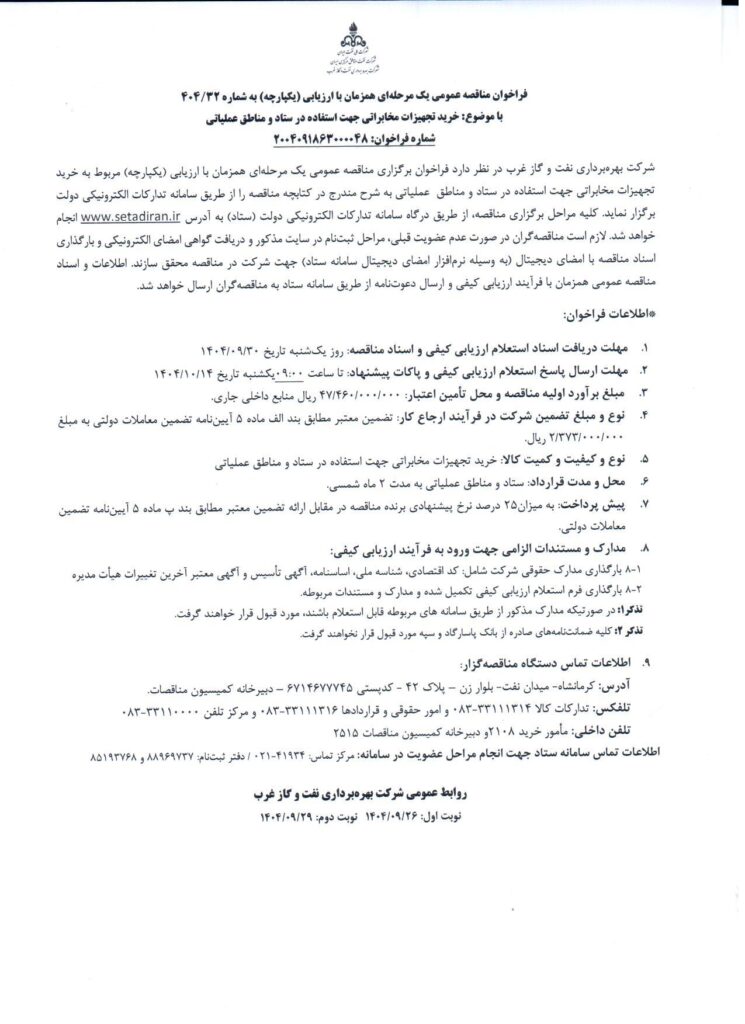 با موضوع: خرید تجهیزات مخابراتی جهت استفاده در ستاد و مناطق عملیاتی